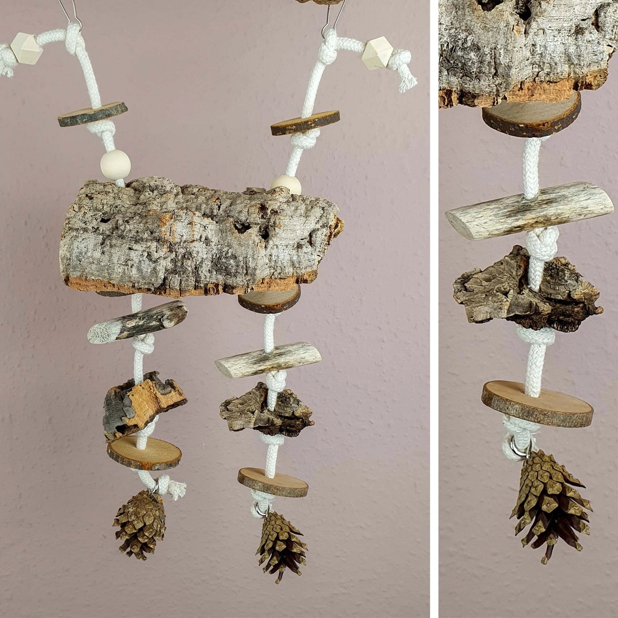 Die Spielplätze sind zusätzlich mit viel unbehandeltem Knabber-Spielzeug ausgestattet. Hier ist gesunde und abwechslungsreiche Beschäftigung gegeben.