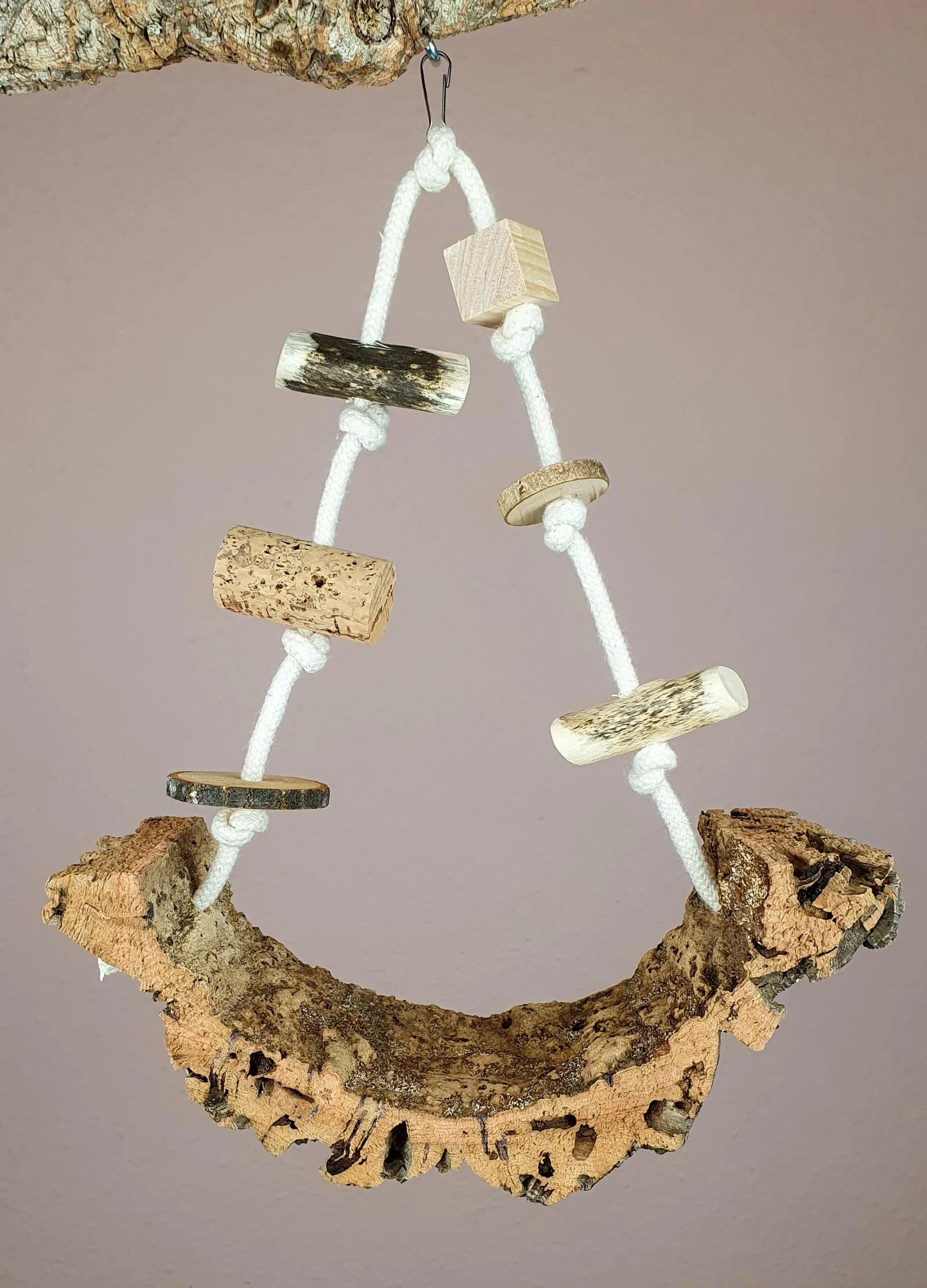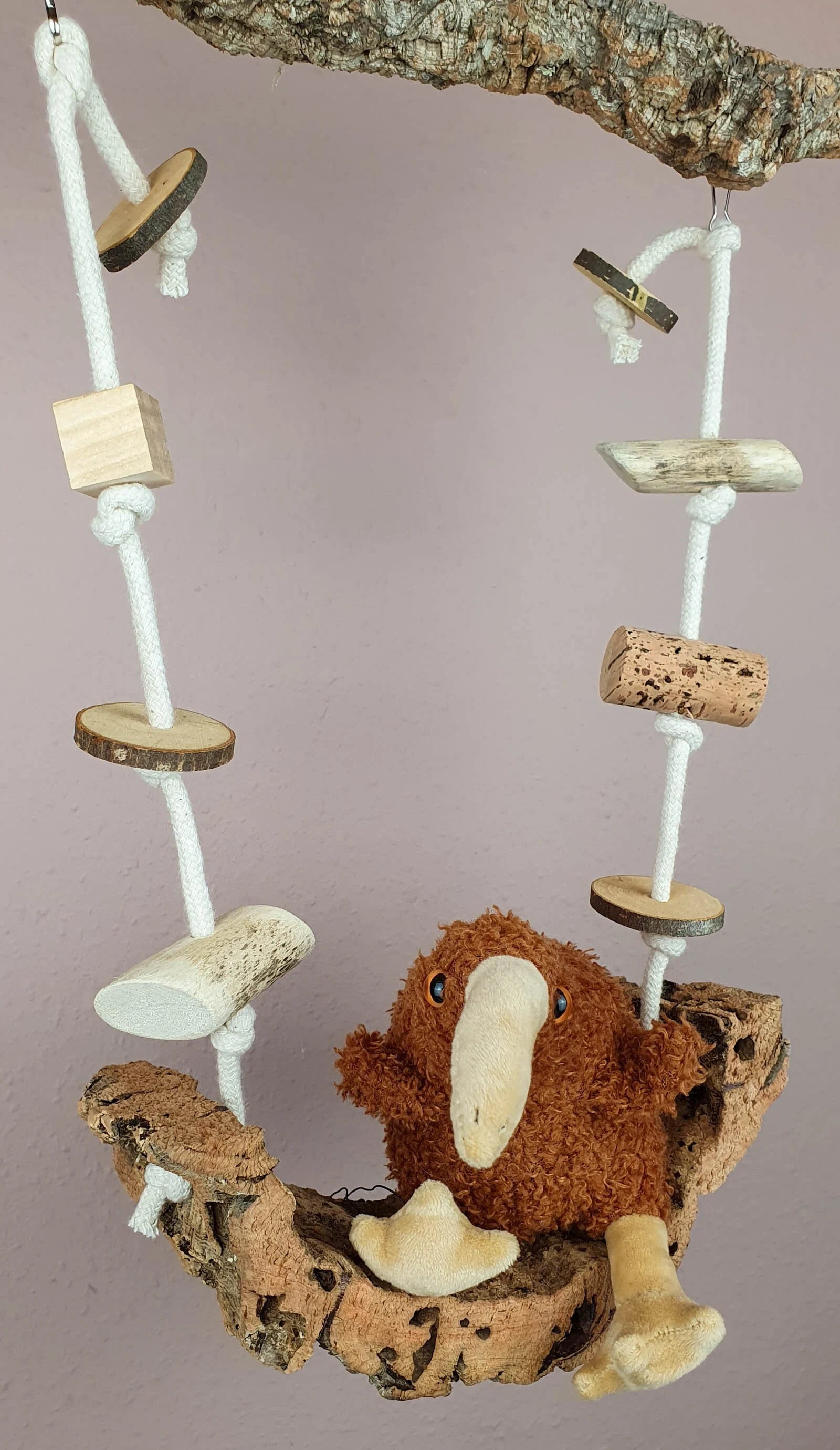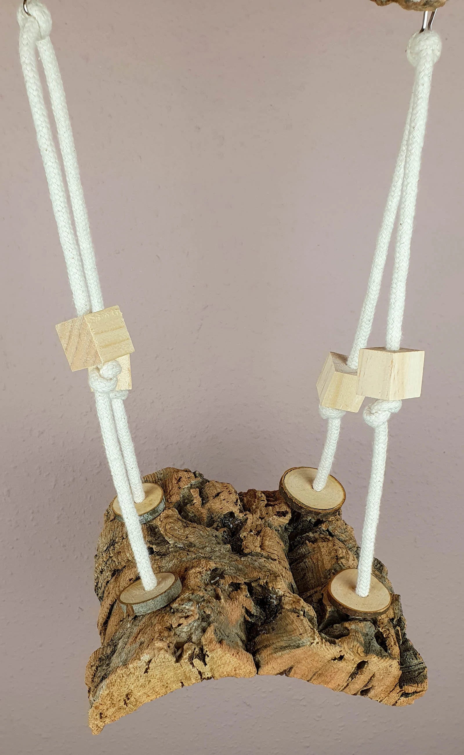 Unsere Schaukeln bestehen aus weicher, unebener Kork-Rinde, die dafür sorgt, dass die Füßchen entlastet werden. Meist sind es Schaukel-Sitzbretter auf denen man wunderbar liegen und verweilen kann.