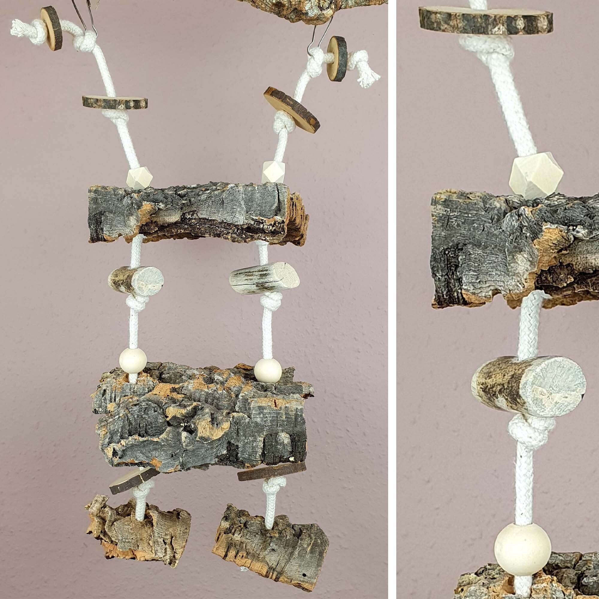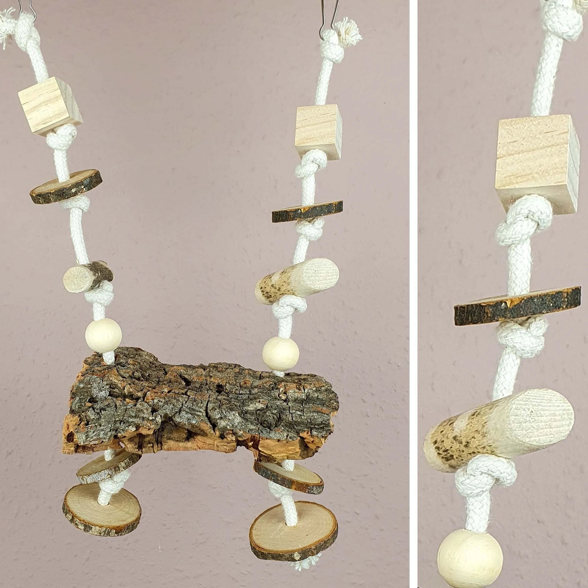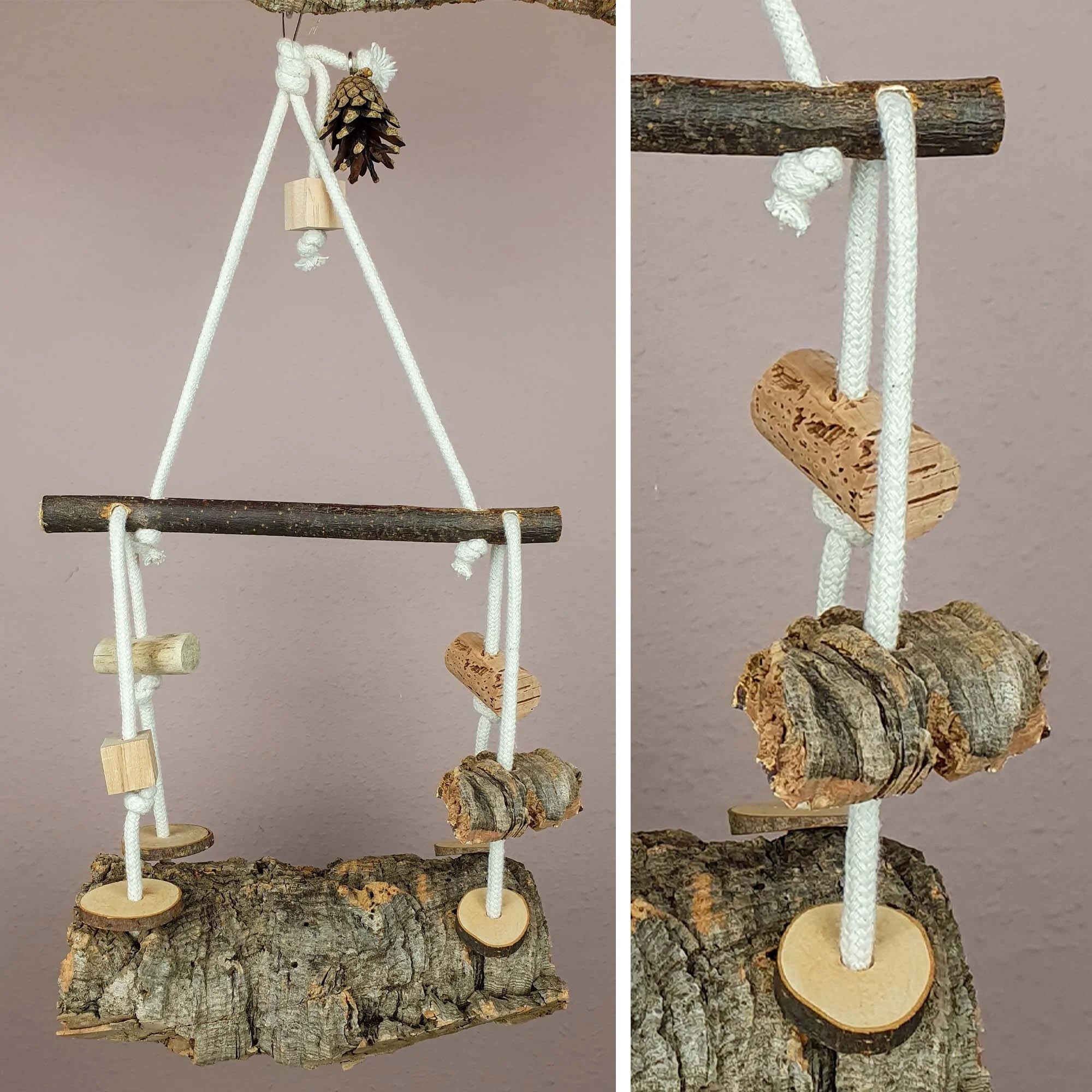 Unsere Schaukeln bestehen aus weicher, unebener Kork-Rinde, die dafür sorgt, dass die Füßchen entlastet werden. Meist sind es Schaukel-Sitzbretter auf denen man wunderbar liegen und verweilen kann.