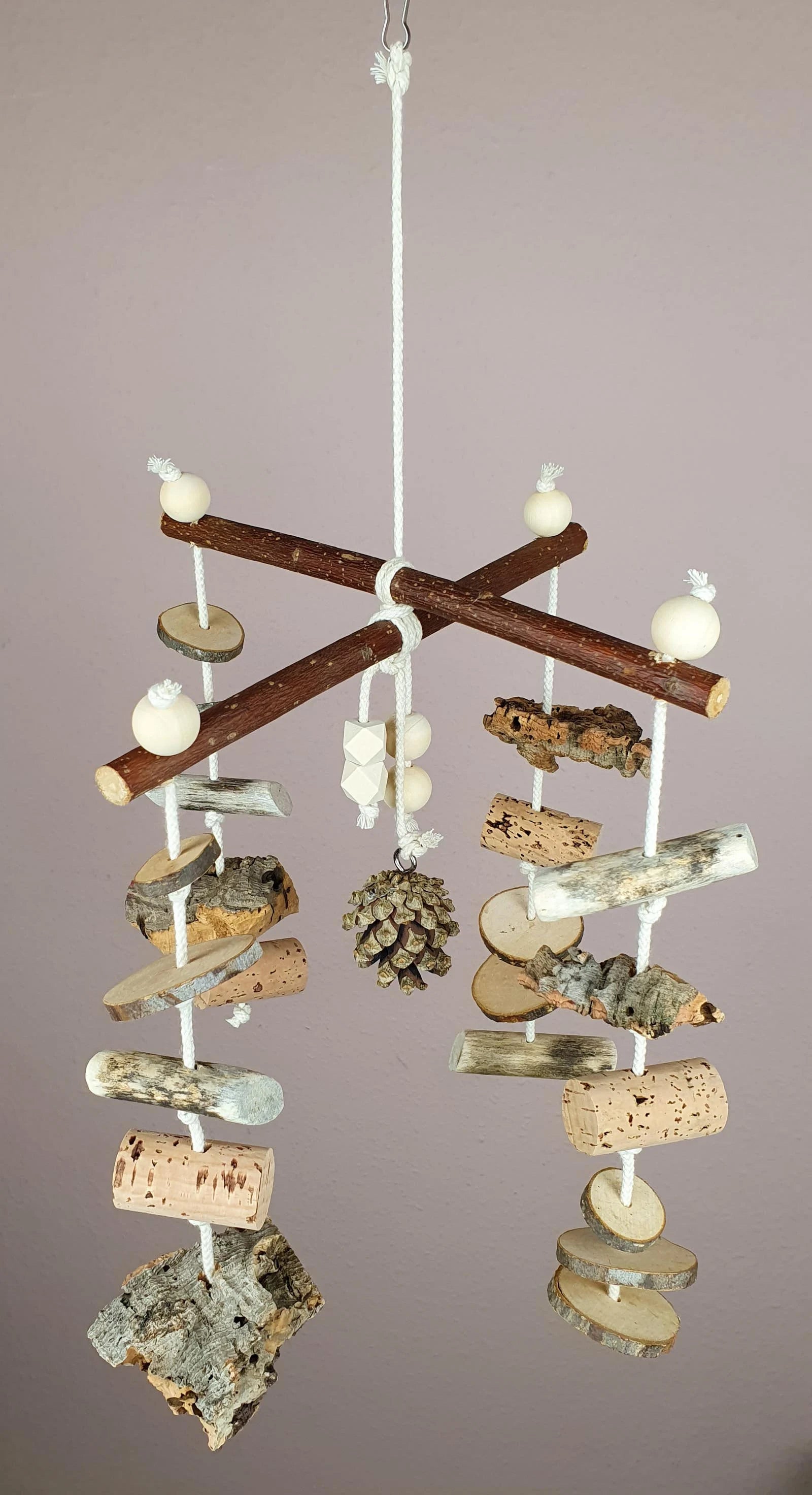 Viele ausgefallene Spielsachen, meist zum Hängen aus unbehandelten Materialien wie Kork-Eiche, Holzperlen, Tribholz, Luffa, Tannenzapfen....