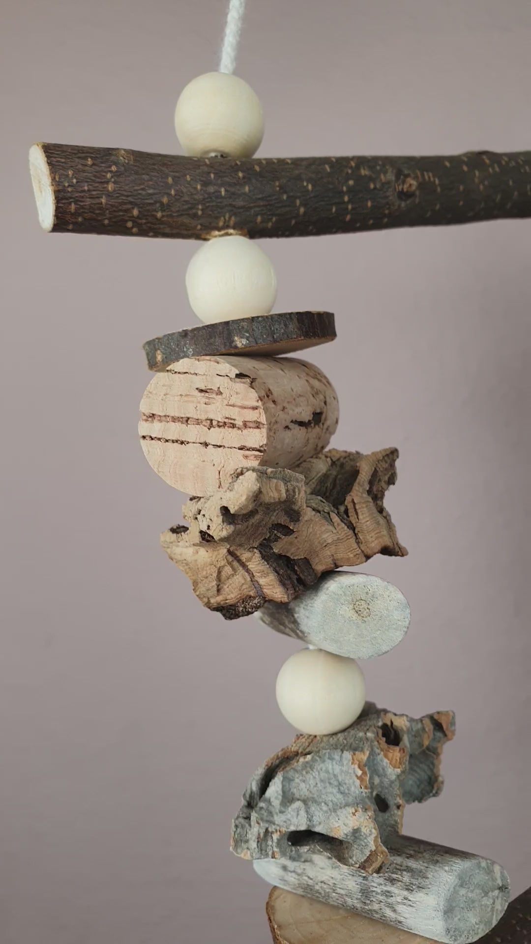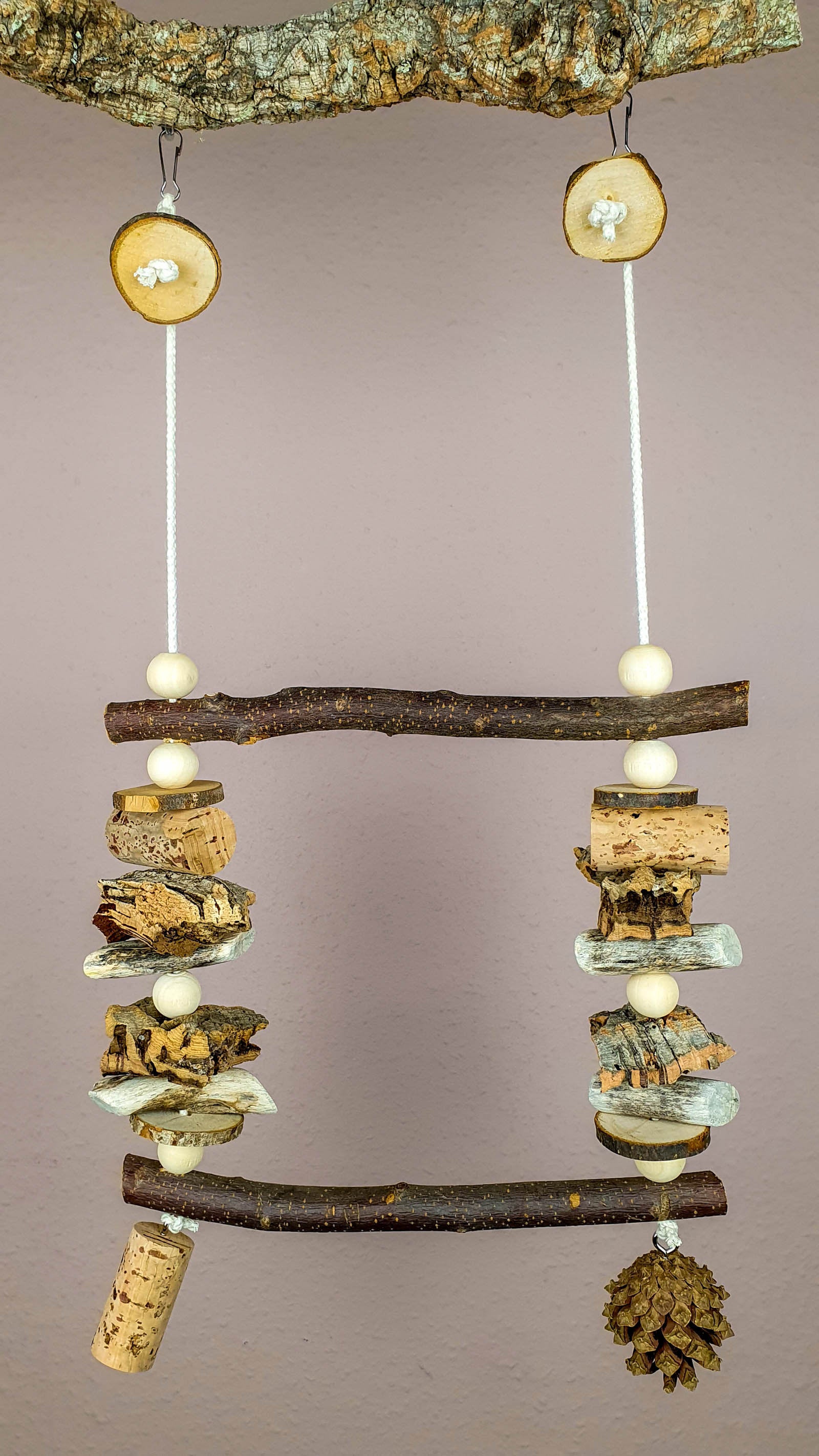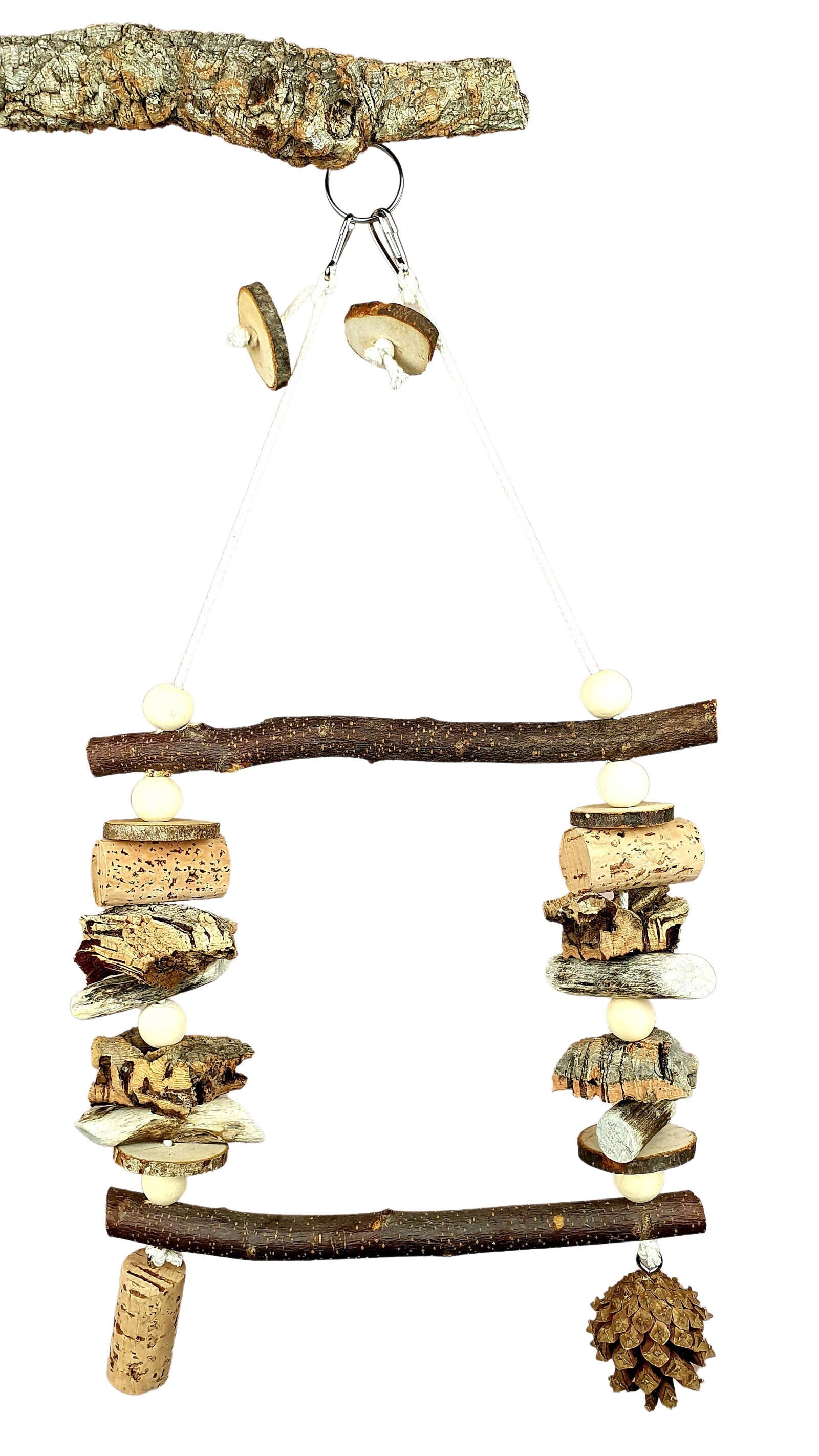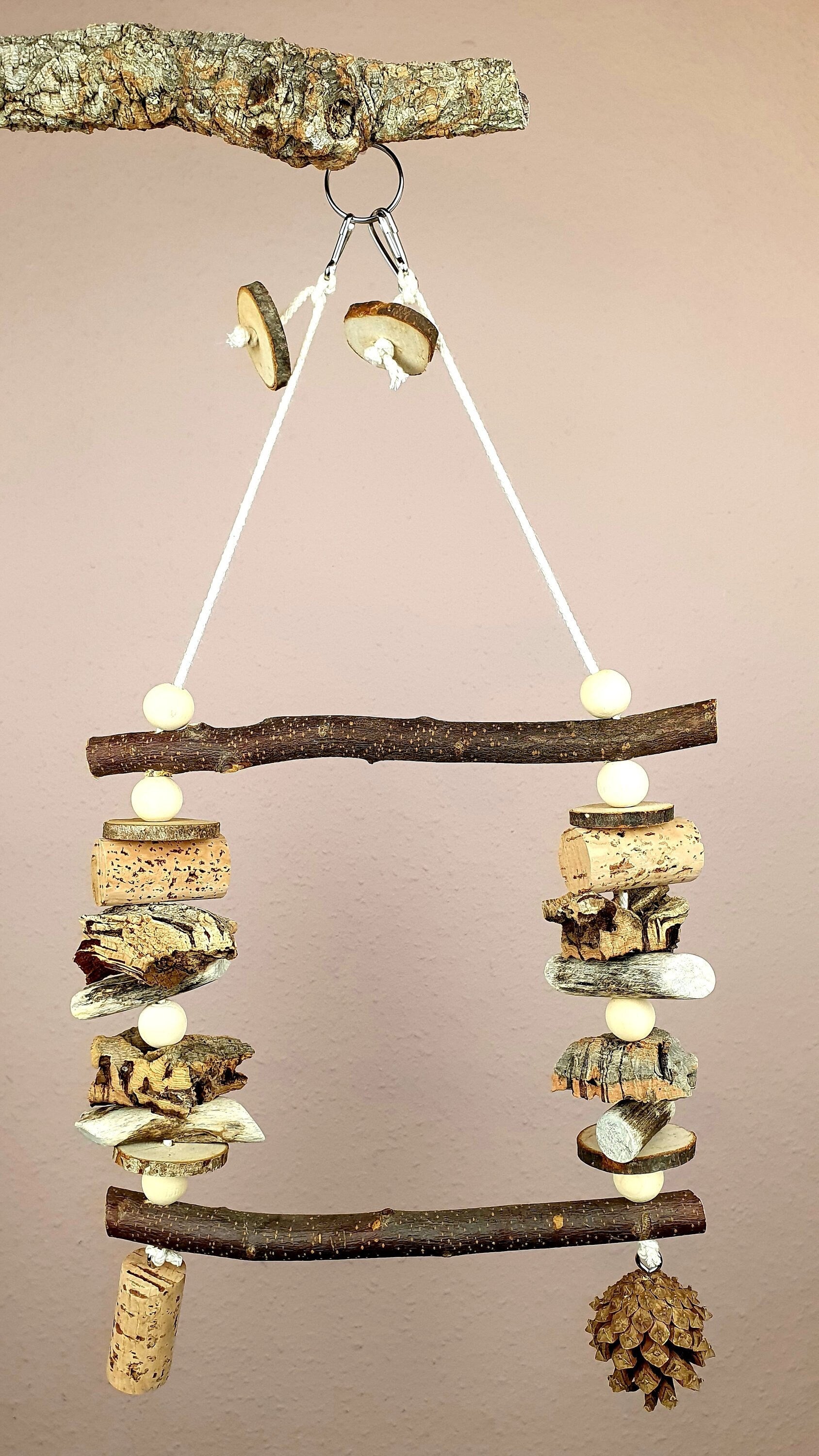Das Vogelspielzeug besteht aus natürlichen, unbehandelten Hölzern. Hier kommt bestimmt keine Langeweile auf.