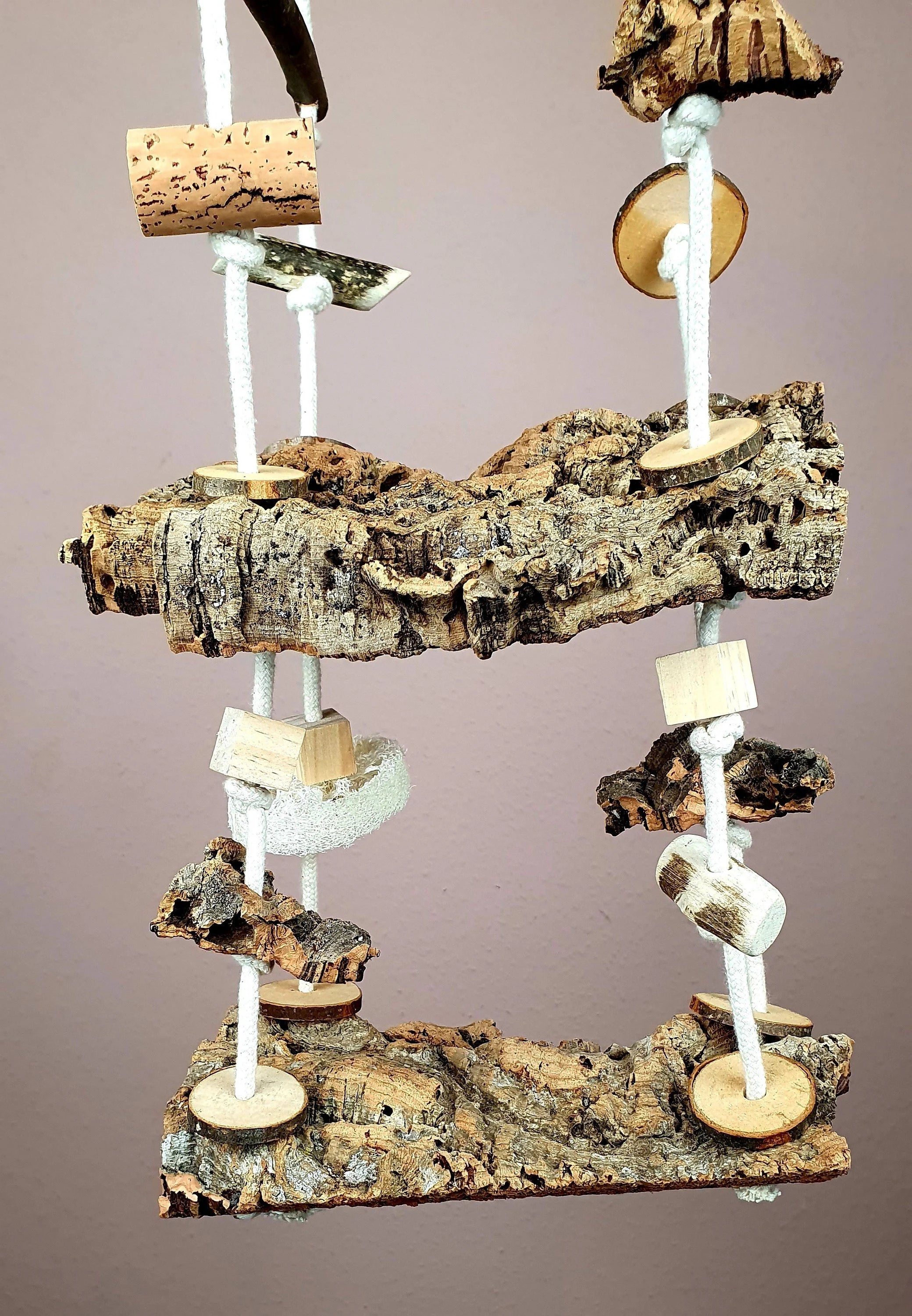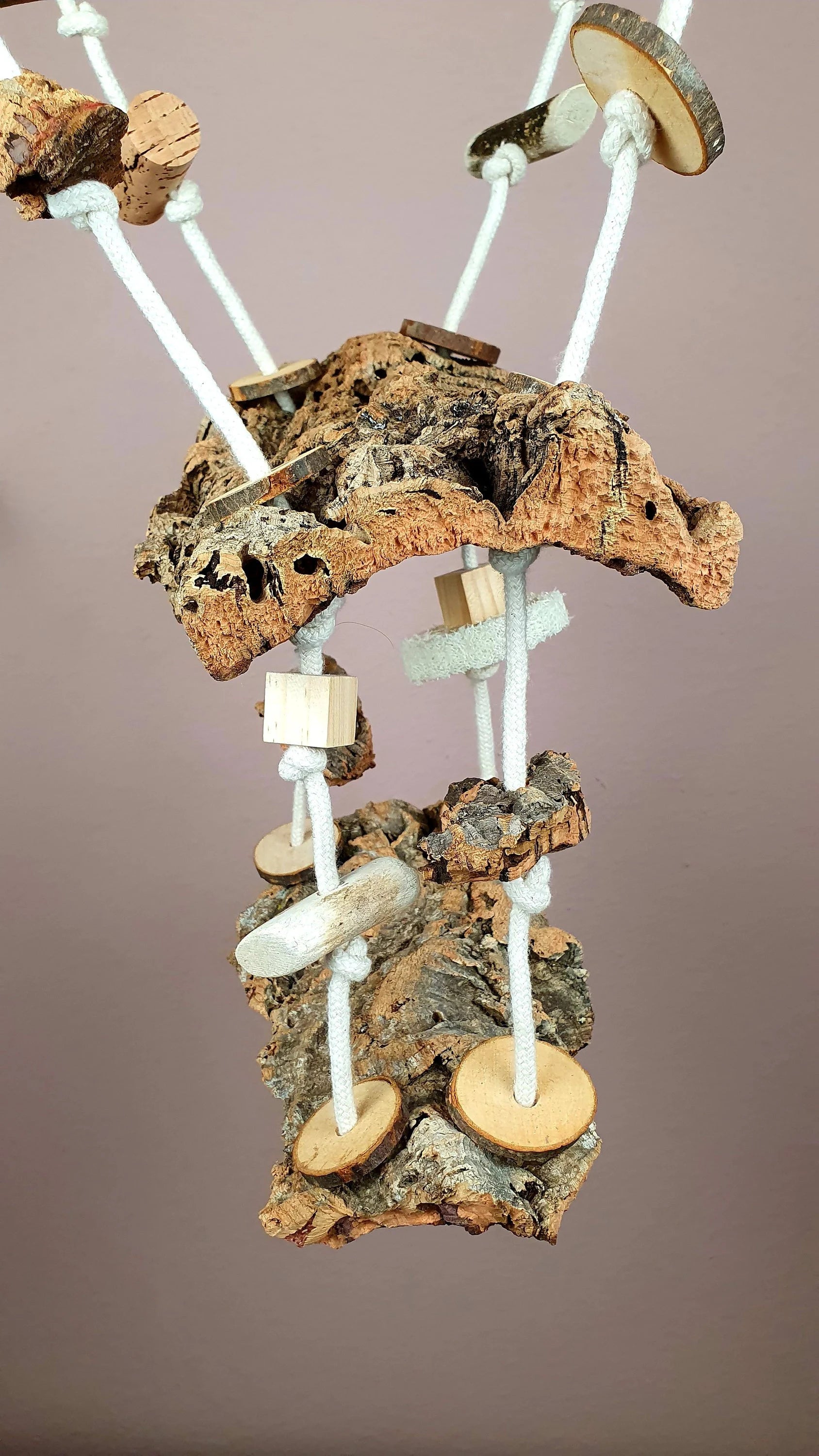 Die zwei Korkrinden-Sitzbretter bieten Platz für mehrere kleine Vögel. Zusammen mit Spielzeug aus unbehandeltem Natur-Holz kann hier nach Herzenslust gepickt und geschreddert werden.