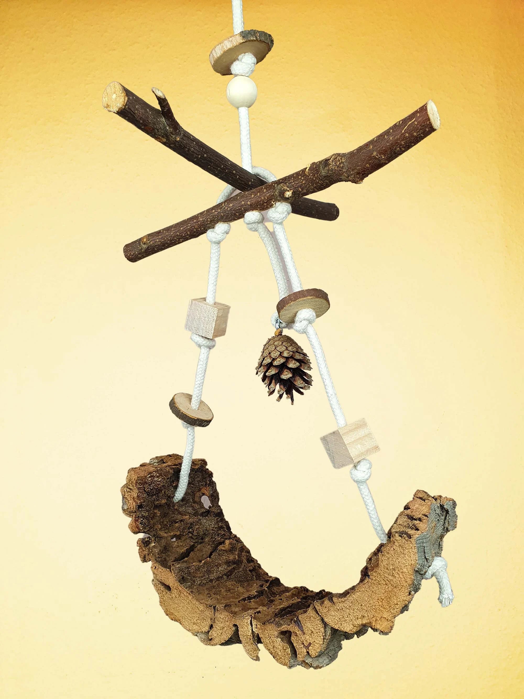 Die Korkrinde wurde bereits gereinigt. Das weiche Baumwollseil ist besonders für Vögel geeignet.