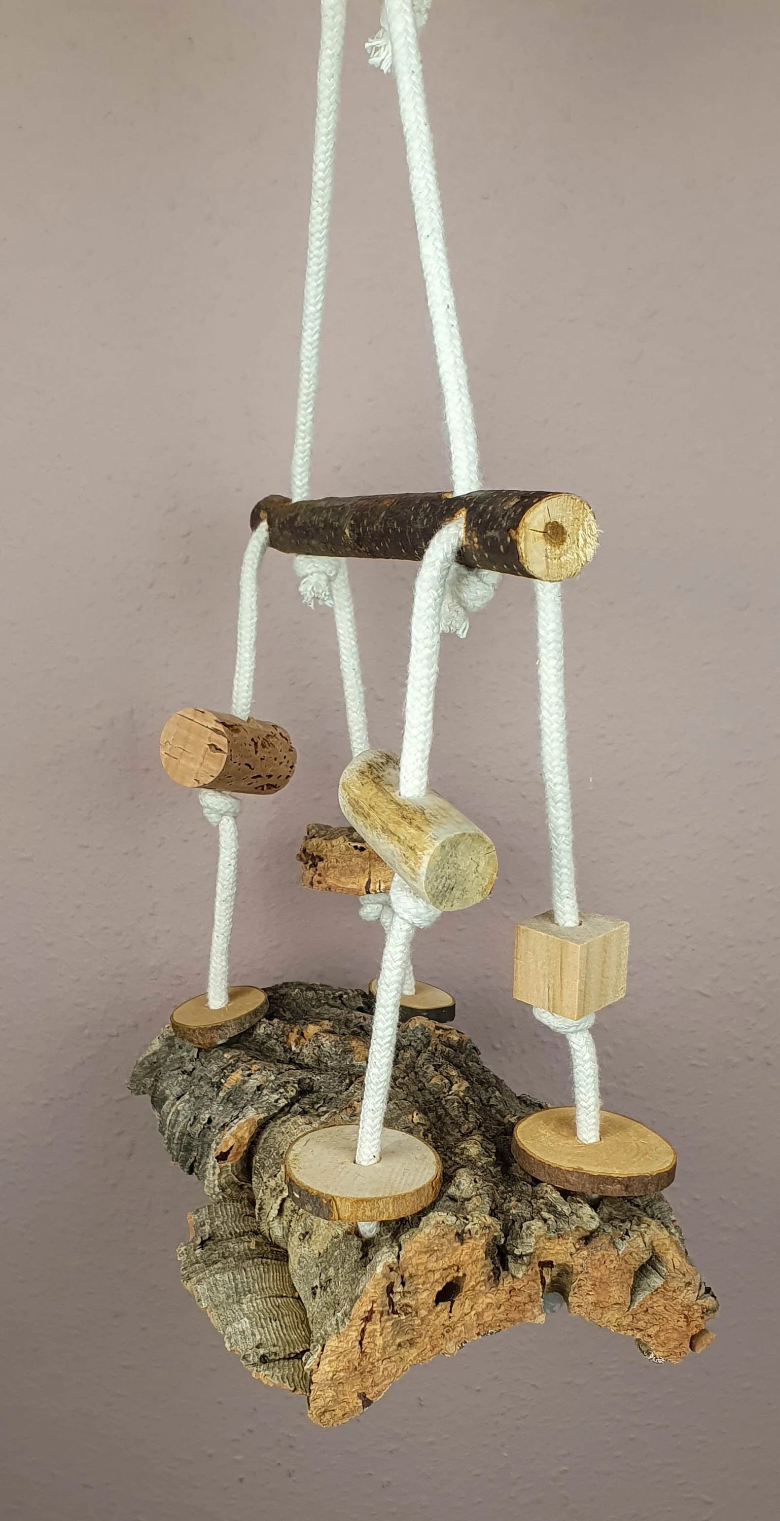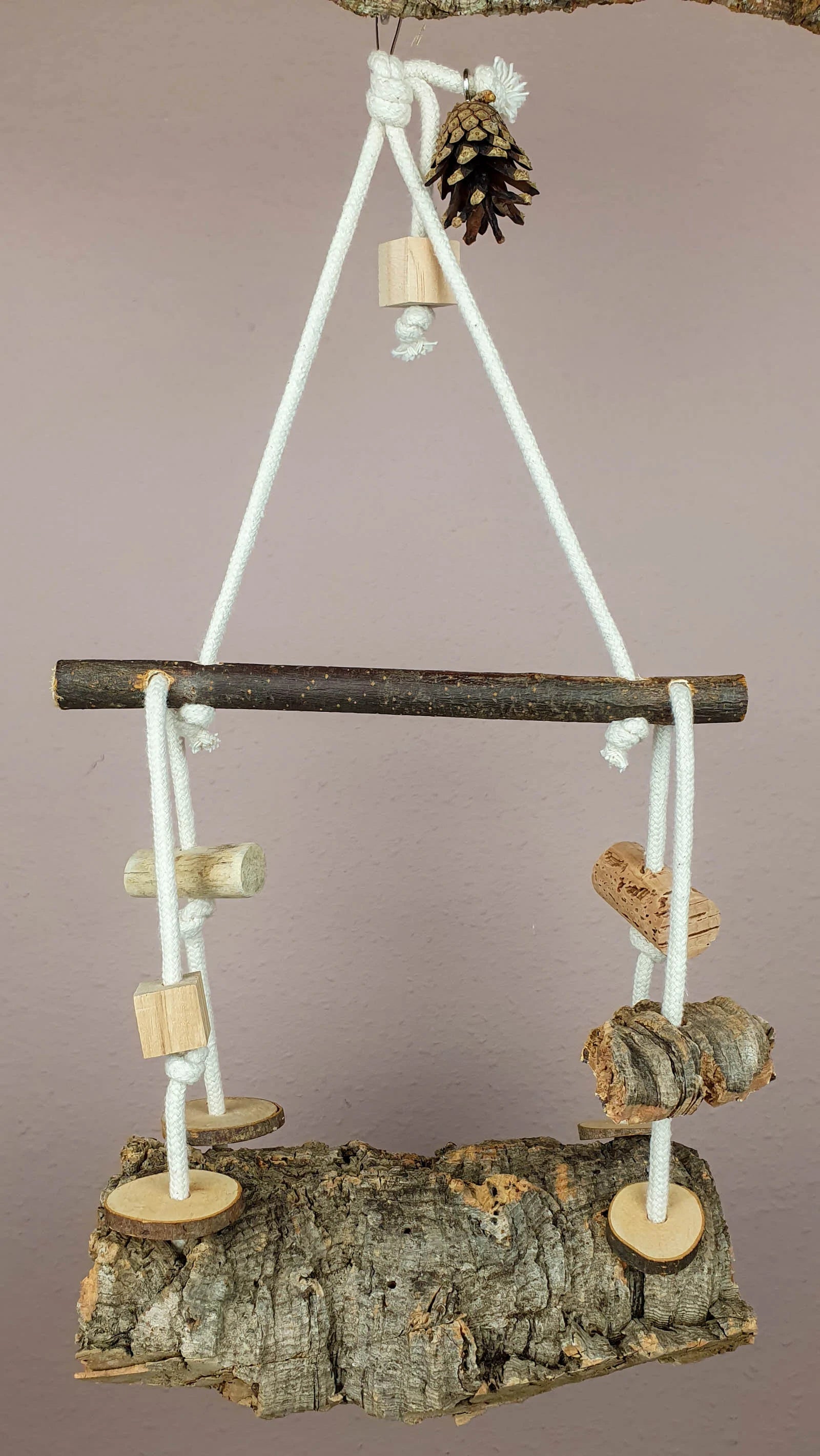 Eine spannende Vogel-Schaukel mit einem Korkrinden-Sitzbrett und zusätzlicher Sitzstange aus Naturholz.